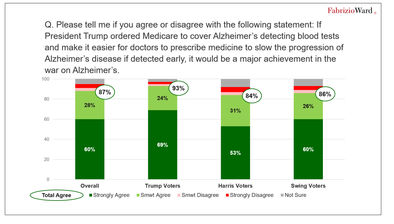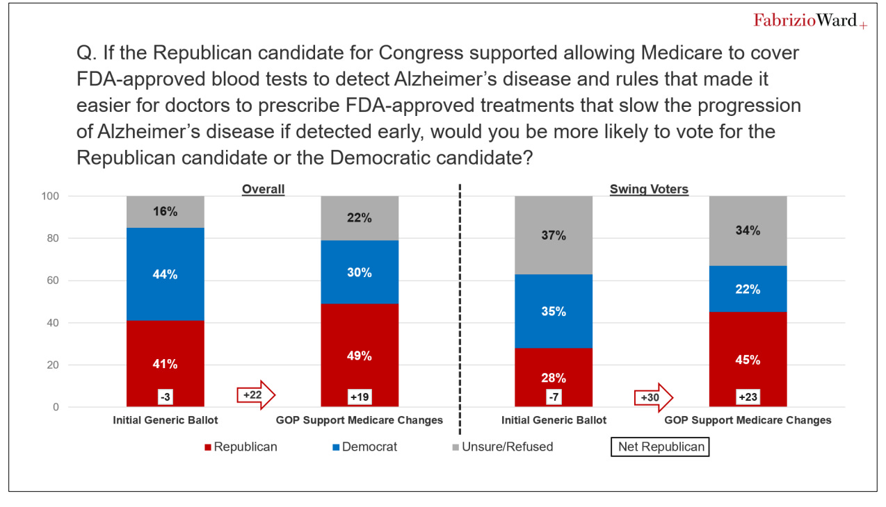 By Matthew Foldi, Editor-in-Chief of the Washington ReporterThe original article is published here.Almost every voter supports changing Medicare rules to allow for doctors to prescribe treatments for Alzheimer’s that are approved by the Food and Drug Administration (FDA), according to a new poll obtained exclusively by the Washington Reporter.The poll, which sources tell the Reporter has made its way to the top levels of the White House, found that 92 percent of voters support a national strategy to finally defeat Alzheimer’s.That near-universal support, found in the poll from Tony Fabrizio and Bob Ward on behalf of Plymouth Union Public Research, spanned 28 of the most competitive House districts in America; the poll’s margin of error is 2.8 percent.Virtually every voter supported changing Medicare rules to make it easier for doctors to prescribe FDA-approved treatments that could slow Alzheimer’s; critically, the poll also found that voters would give President Donald Trump and congressional Republicans the credit, too.A whopping 87 percent of voters would credit Trump if he orders Medicare to cover Alzheimer’s detection tests, and Republicans who back a similar policy go from a three point deficit against a Democrat to a 19 point lead.